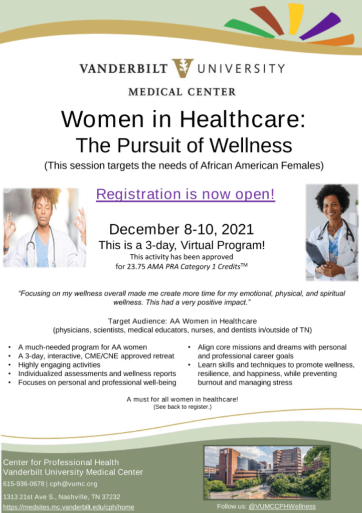 Vanderbilt University Medical Center is offering Women in Healthcare: The Pursuit of Wellness, a three-day virtual program that targets the needs of African American Females, December 8-10, 2021. Registration is now open at https://medsites.vumc.org/cph/womens-retreat. This activity has been approved for 23.75 AMA PRA Category 1 CreditsTM.